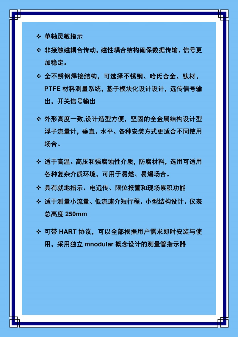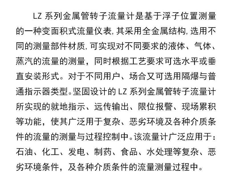 LZ系列金屬管轉(zhuǎn)子流量計是基于浮子位置測量的一種變面積式流量儀表,其采用全金屬結(jié)構(gòu),選用不同的測量部件材質(zhì),可實現(xiàn)對不同要求的液體、氣體、蒸汽的流量的測量,同時根據(jù)工藝要求可選水平或垂直安裝形式。